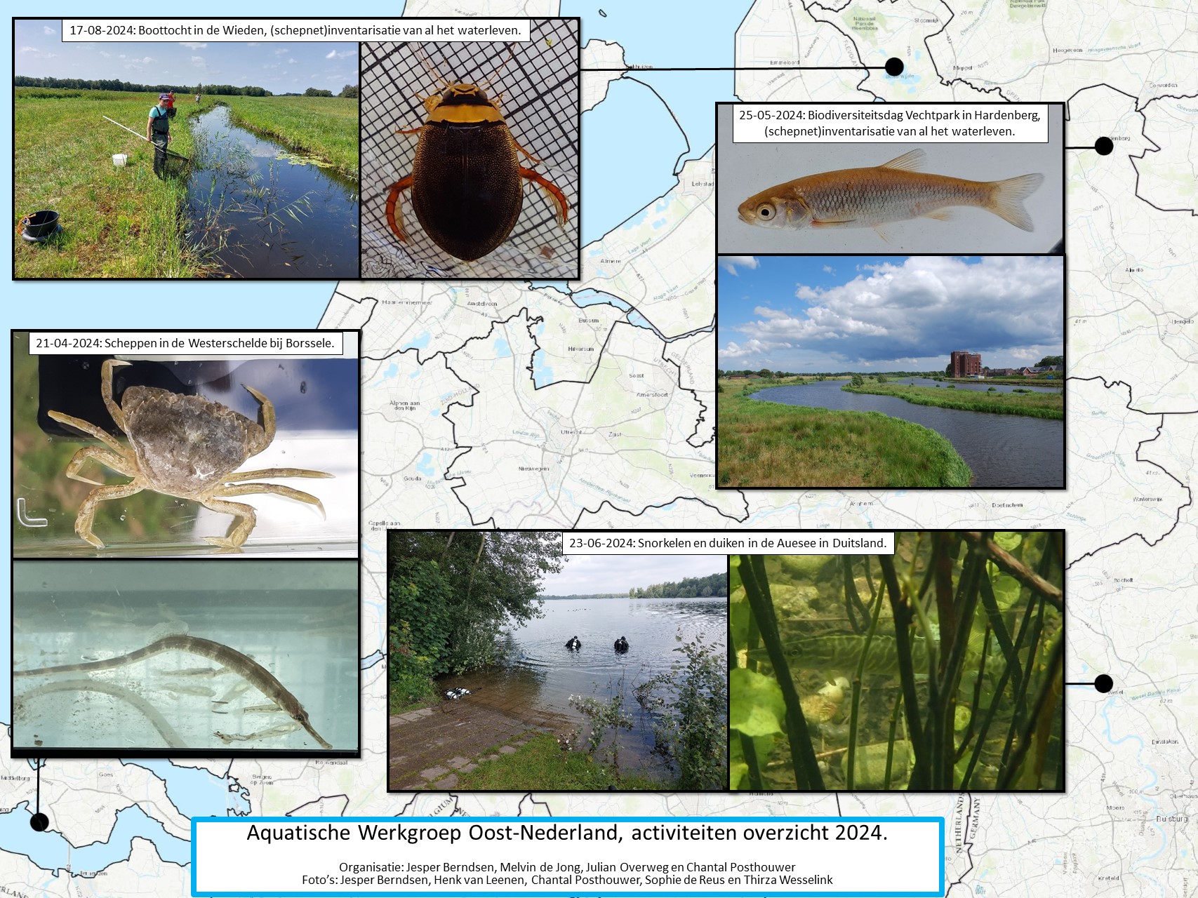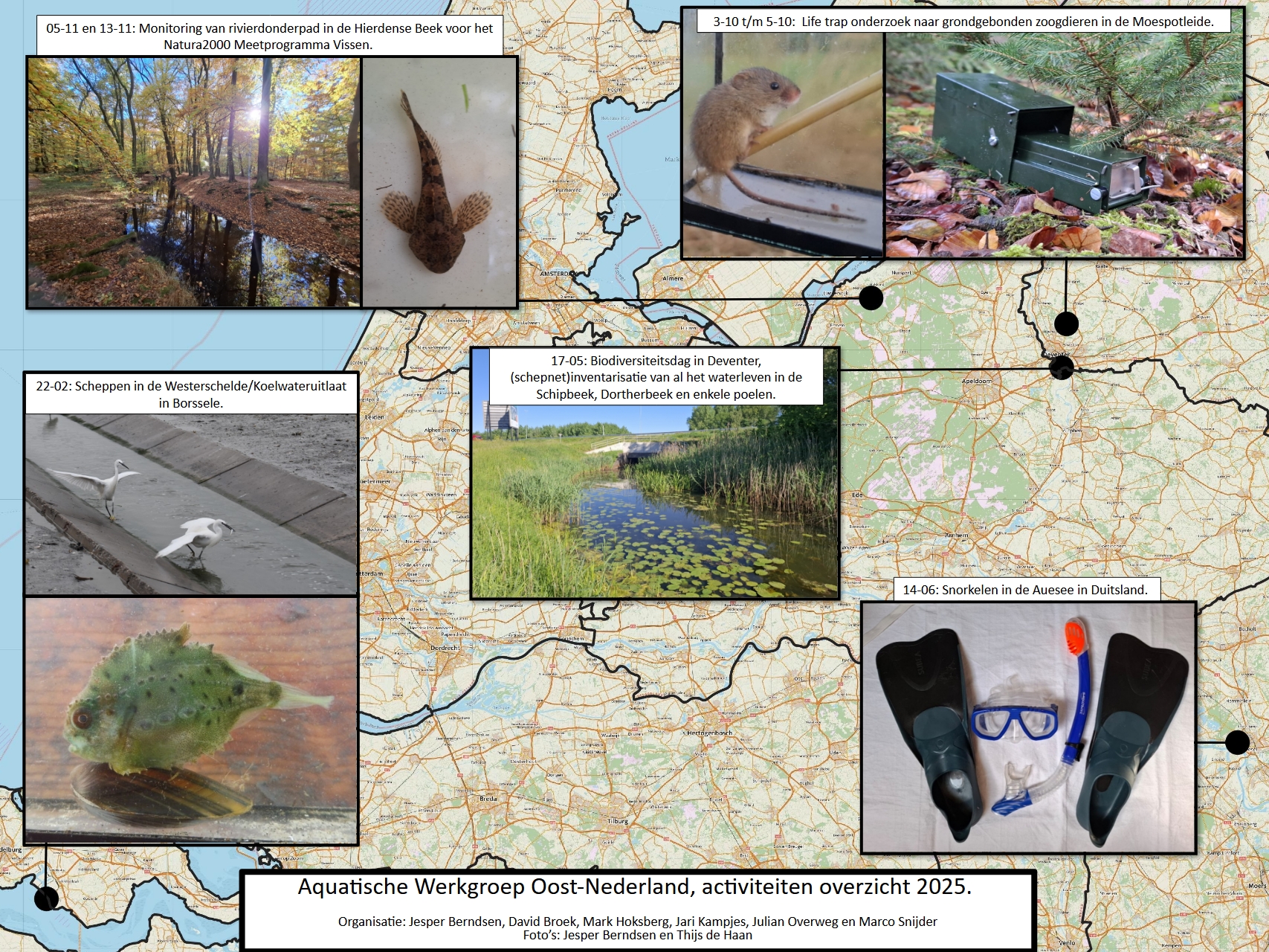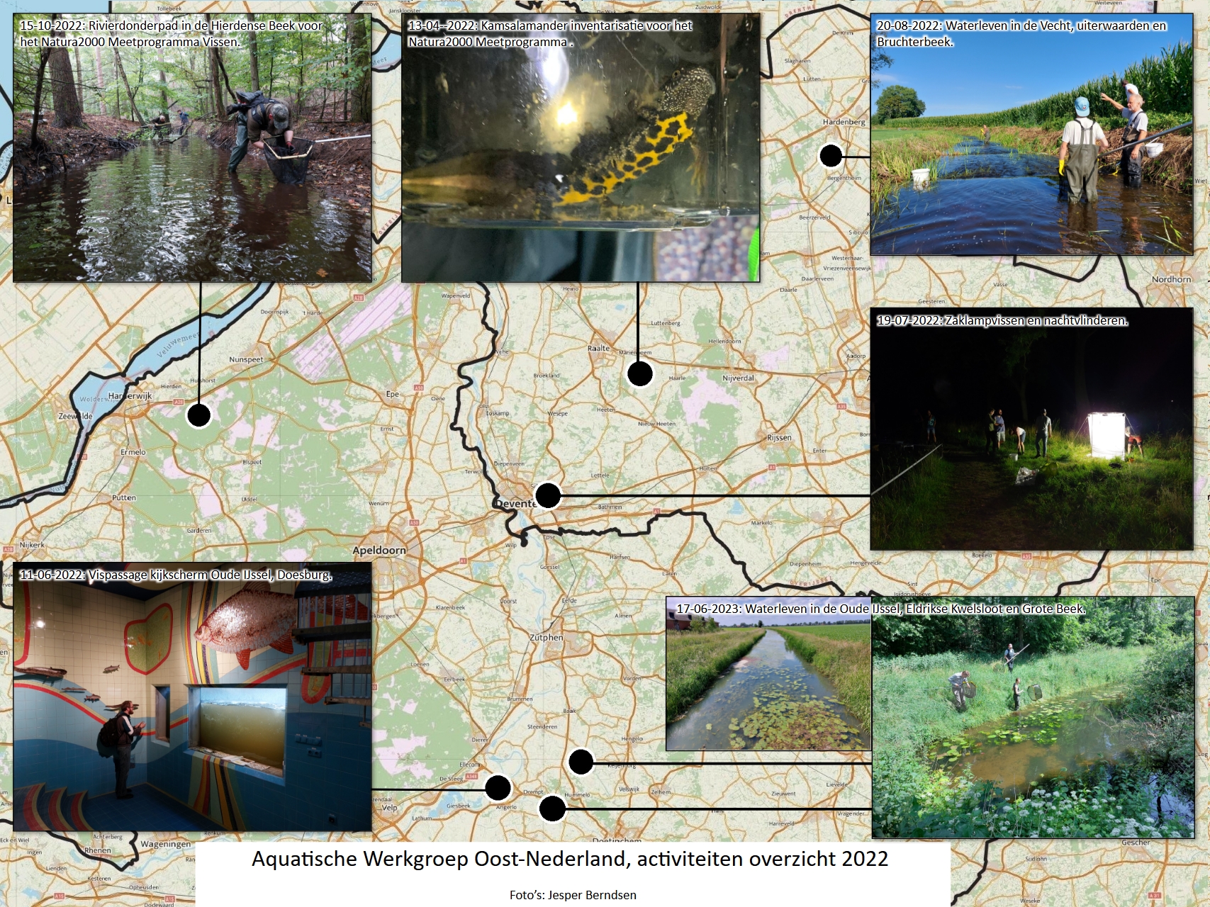 De Aquatische Werkgroep Oost-Nederland (AWON) is opgericht in 2021. Het is ons doel om geïnteresseerden (professionals, vrijwilligers en leken) in vissen, amfibieën en andere watergebonden soortgroepen uit de (ruime) omgeving van Deventer-Hardenberg bij elkaar te brengen en samen wateren in deze regio (soms ver daarbuiten) te inventariseren op de aanwezige soorten. Dit doen we door jaarlijks, verspreid door het jaar, vier afwisselende excursies te organiseren. Deze vinden zowel ’s avonds met de zaklamp als overdag met fuiken of het schepnet plaats. Door samen op pad te gaan hebben we een leuke velddag, kunnen we van elkaar leren en verzamelen we ook nog eens waardevolle gegevens uit de natuur. Daarnaast hebben we ook een appgroep om elkaar op de hoogte te houden van onze veldplannen en leuke wetenswaardigheden.